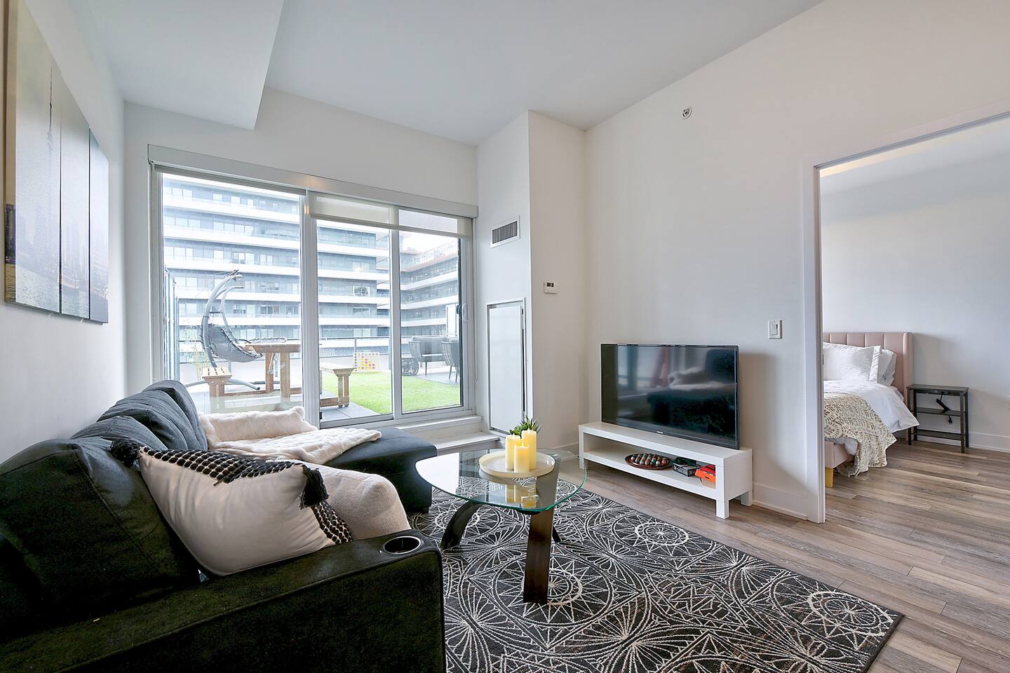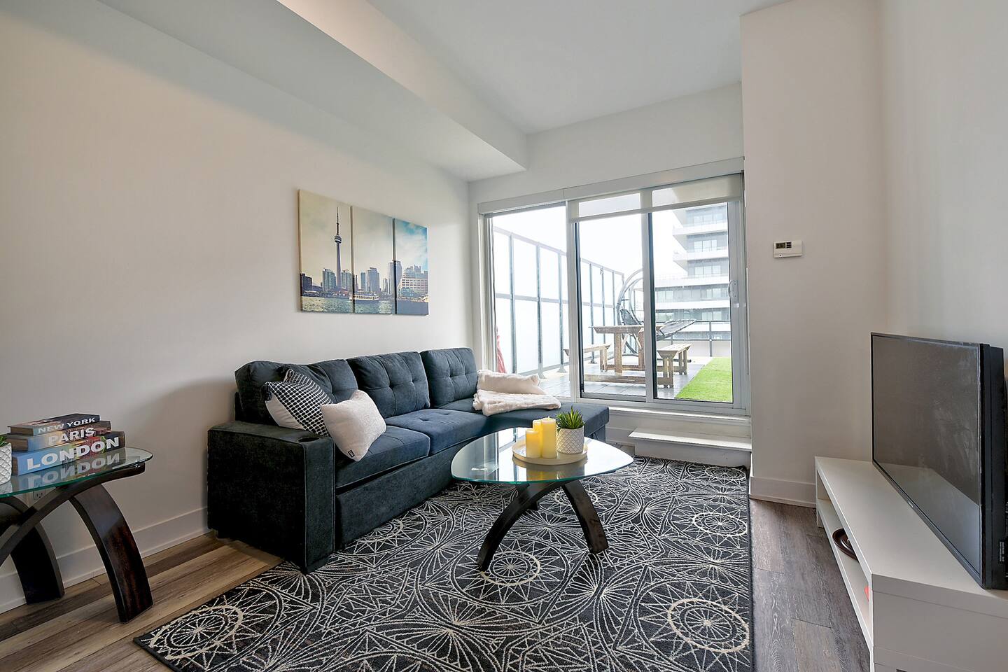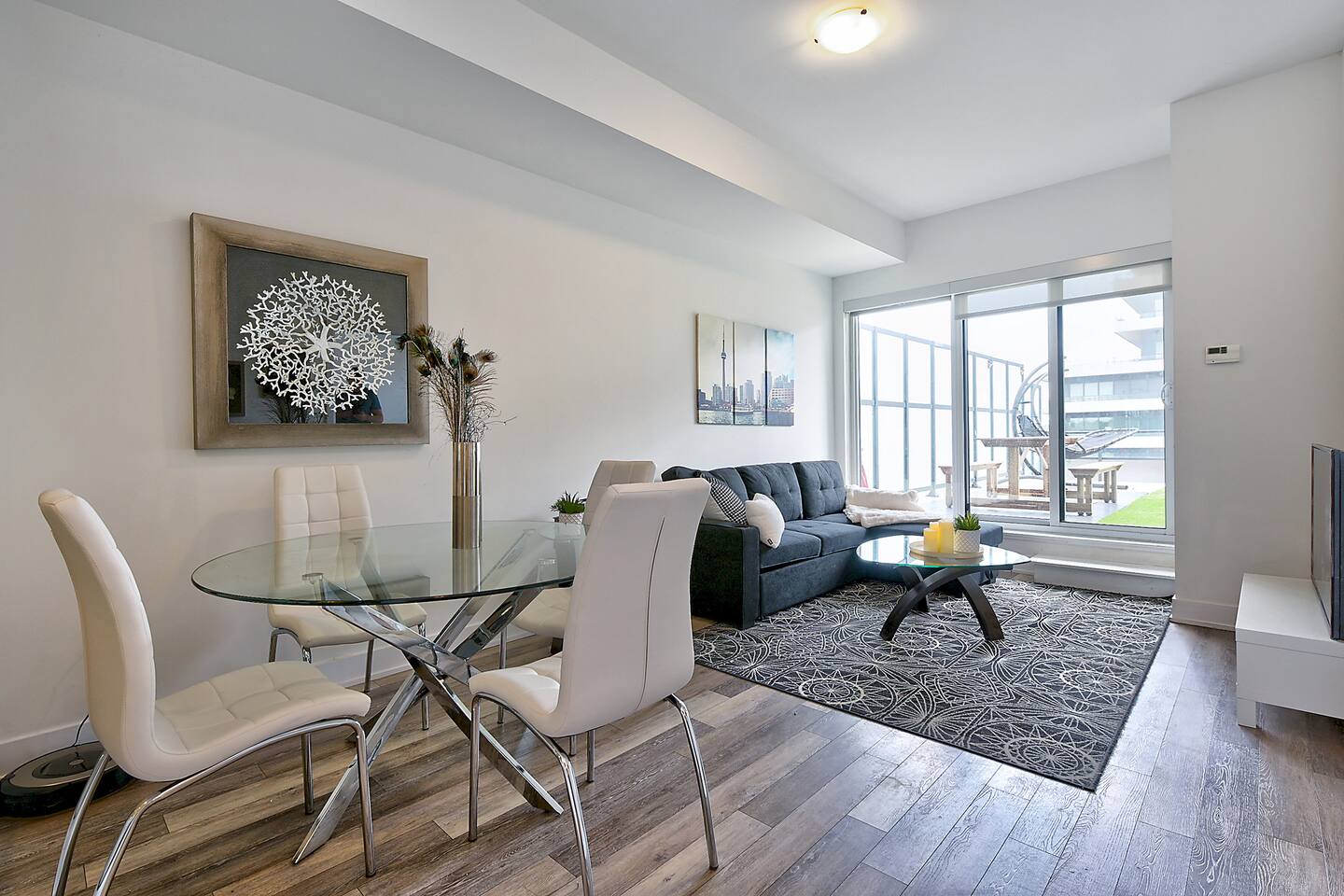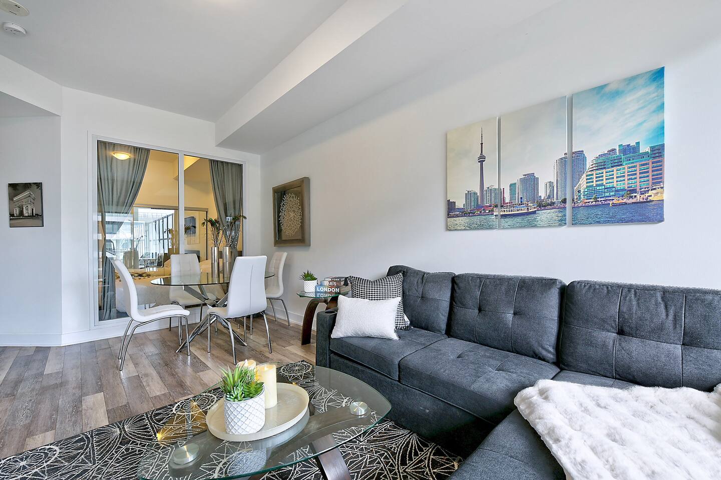 A modern and comfortable living space with all the amenities you need for a relaxing stay. The open-plan layout with soaring ceilings, allows for ample space and natural light and boasting stunning lake views and a mesmerizing panorama of Toronto's skyline. Savor your morning coffee or evening cocktails on the spacious private patio, which also features a BBQ for all your grilling pleasures. A parking spot is also included for your convenience. Our very comfortable sofa coverts to a queen pullout sofa allowing for up to 2 additional guests.