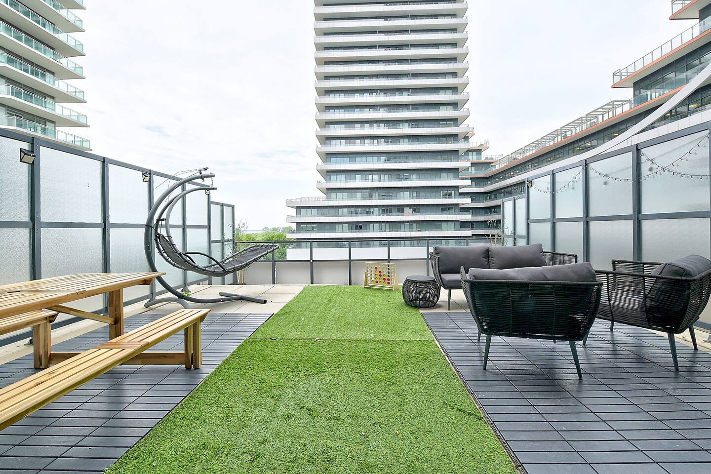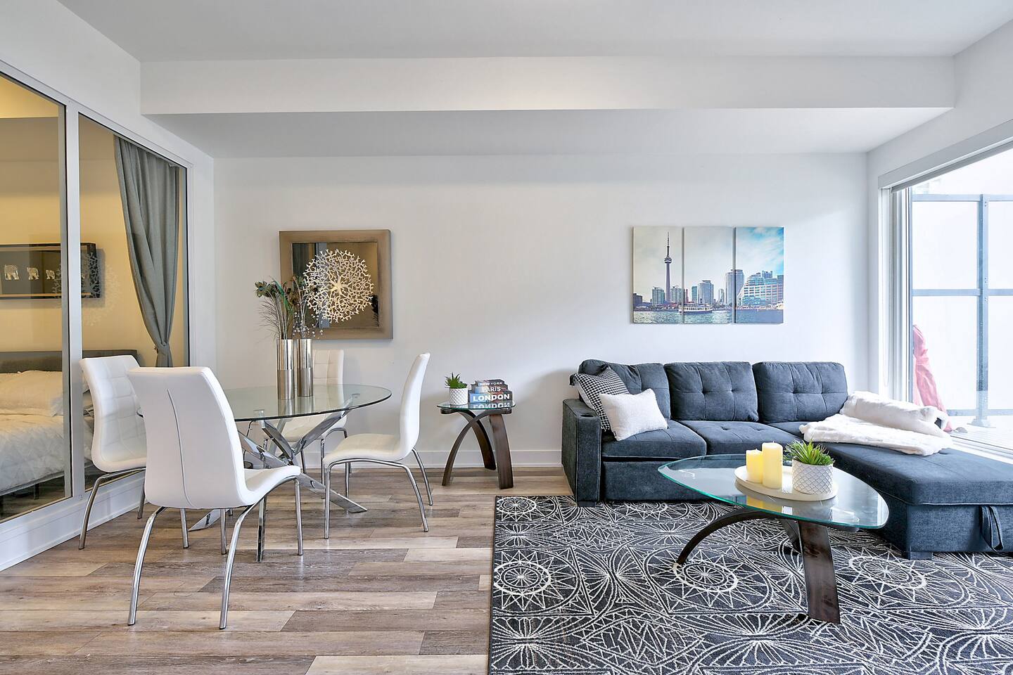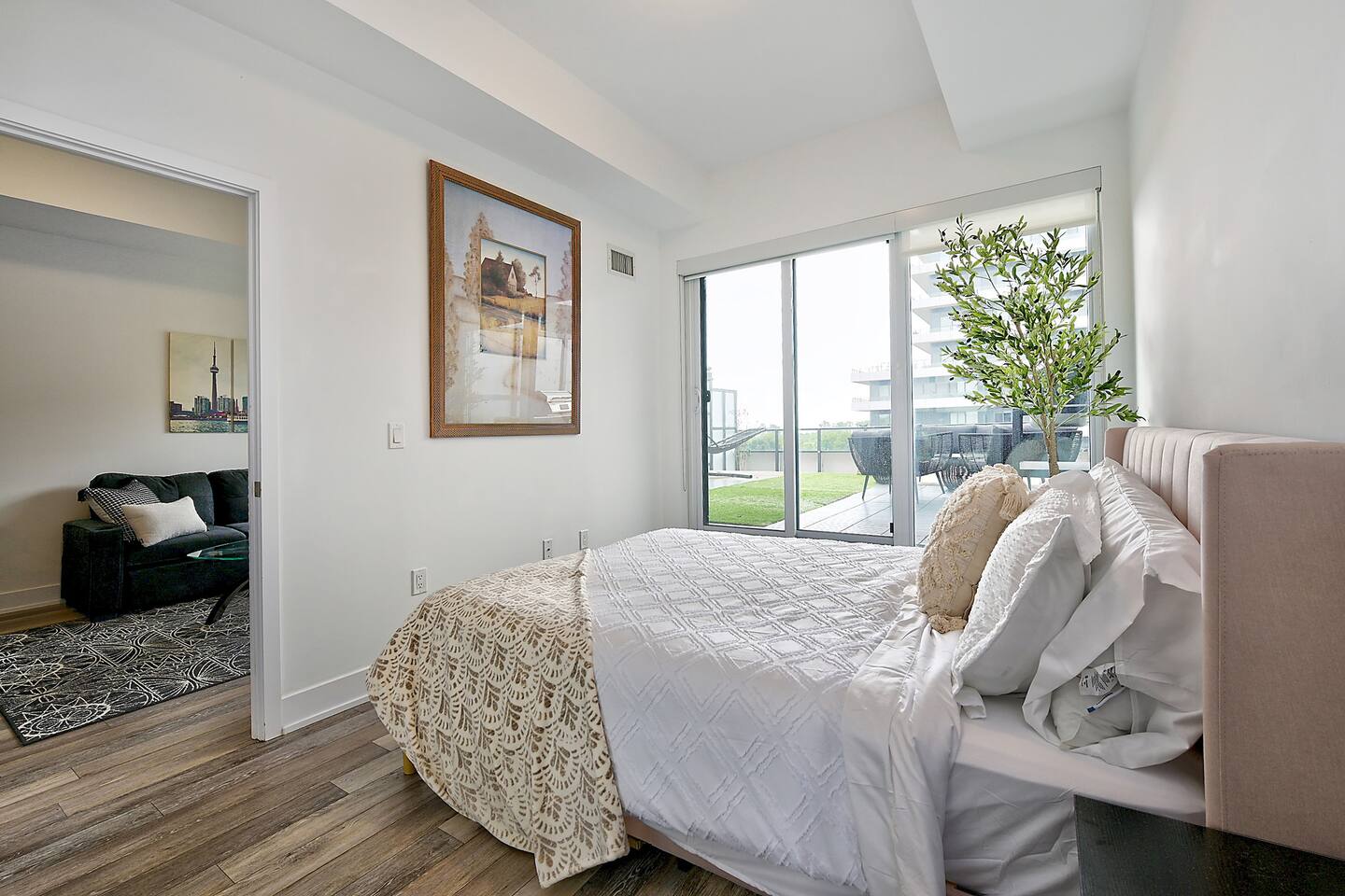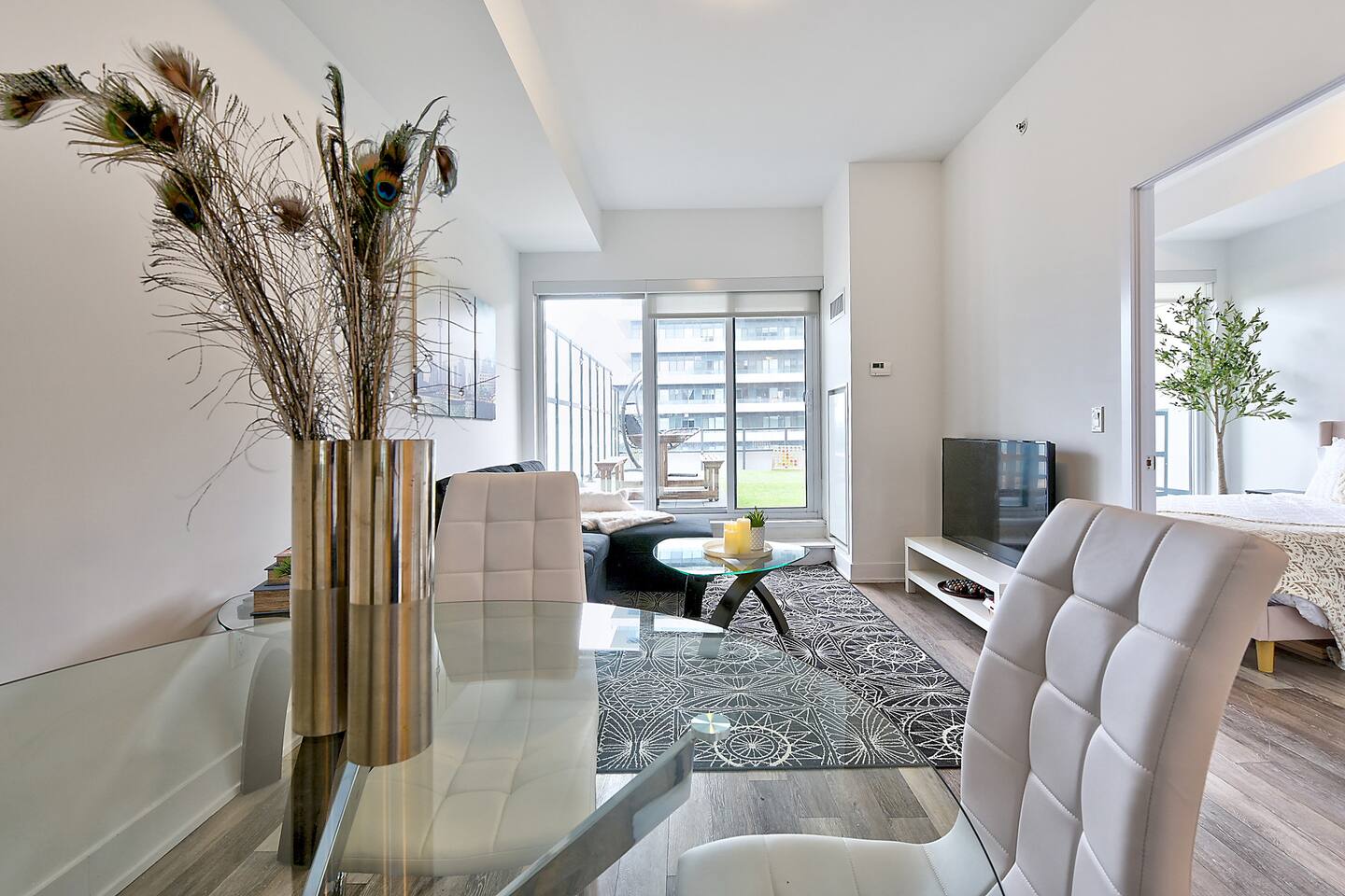 A modern and comfortable living space with all the amenities you need for a relaxing stay. The open-plan layout with soaring ceilings, allows for ample space and natural light and boasting stunning lake views and a mesmerizing panorama of Toronto's skyline. Savor your morning coffee or evening cocktails on the spacious private patio, which also features a BBQ for all your grilling pleasures. A parking spot is also included for your convenience. Our very comfortable sofa coverts to a queen pullout sofa allowing for up to 2 additional guests.
