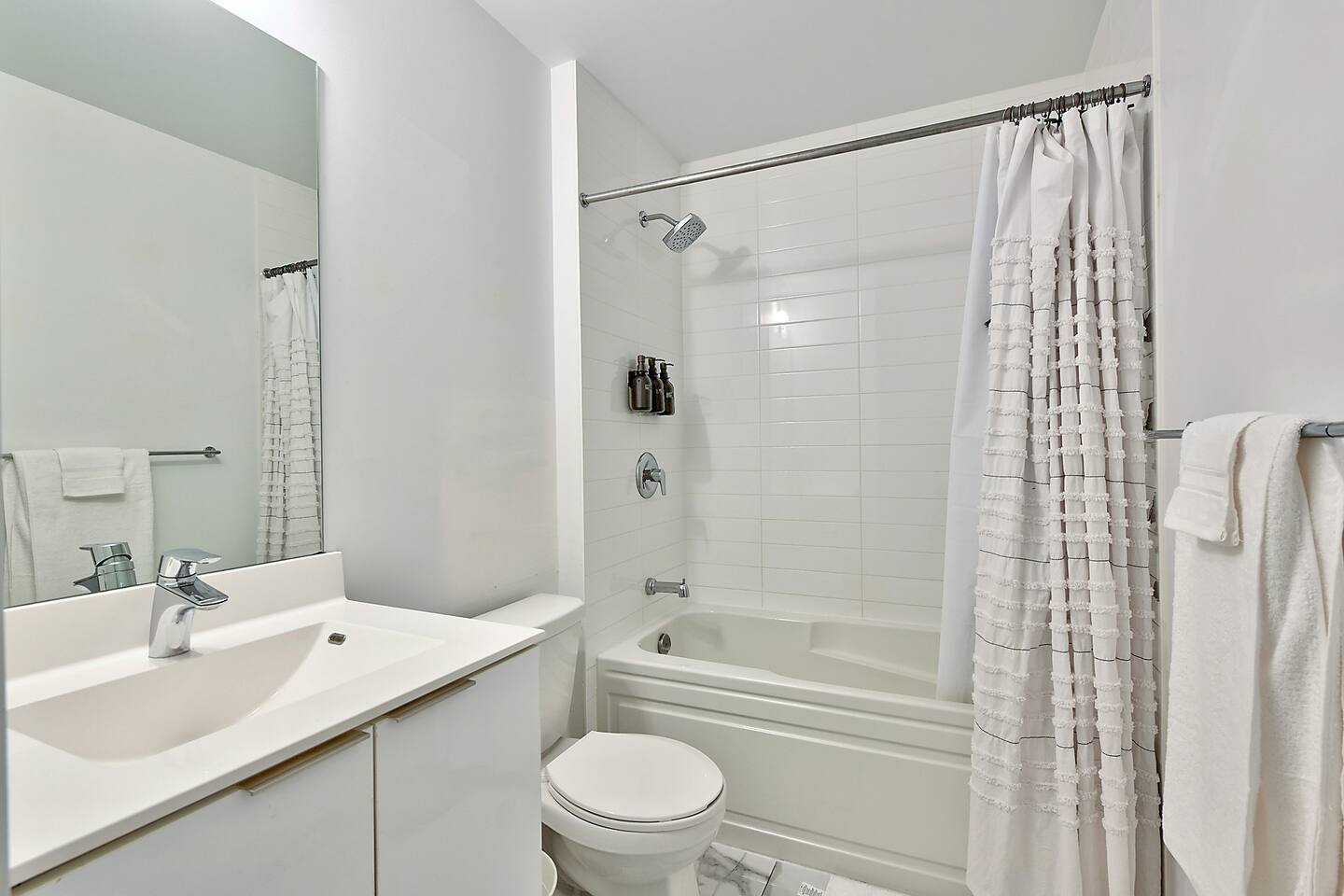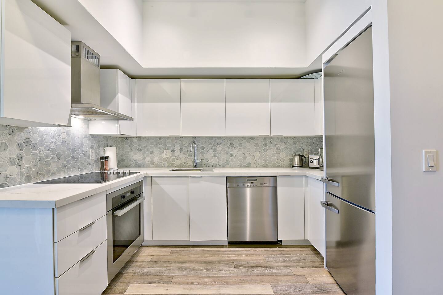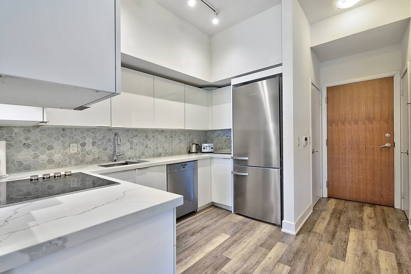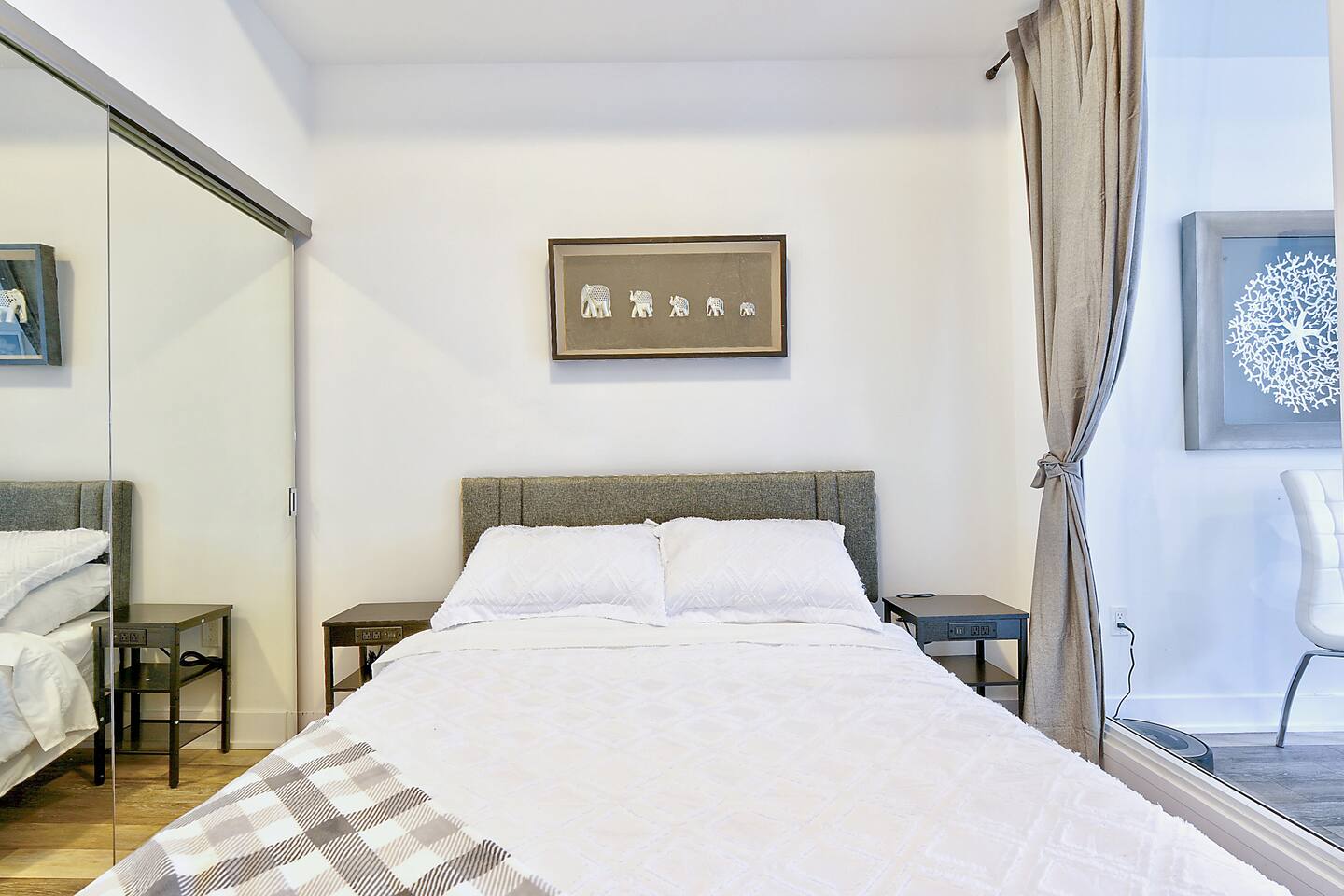 A modern and comfortable living space with all the amenities you need for a relaxing stay. The open-plan layout with soaring ceilings, allows for ample space and natural light and boasting stunning lake views and a mesmerizing panorama of Toronto's skyline. Savor your morning coffee or evening cocktails on the spacious private patio, which also features a BBQ for all your grilling pleasures. A parking spot is also included for your convenience. Our very comfortable sofa coverts to a queen pullout sofa allowing for up to 2 additional guests.