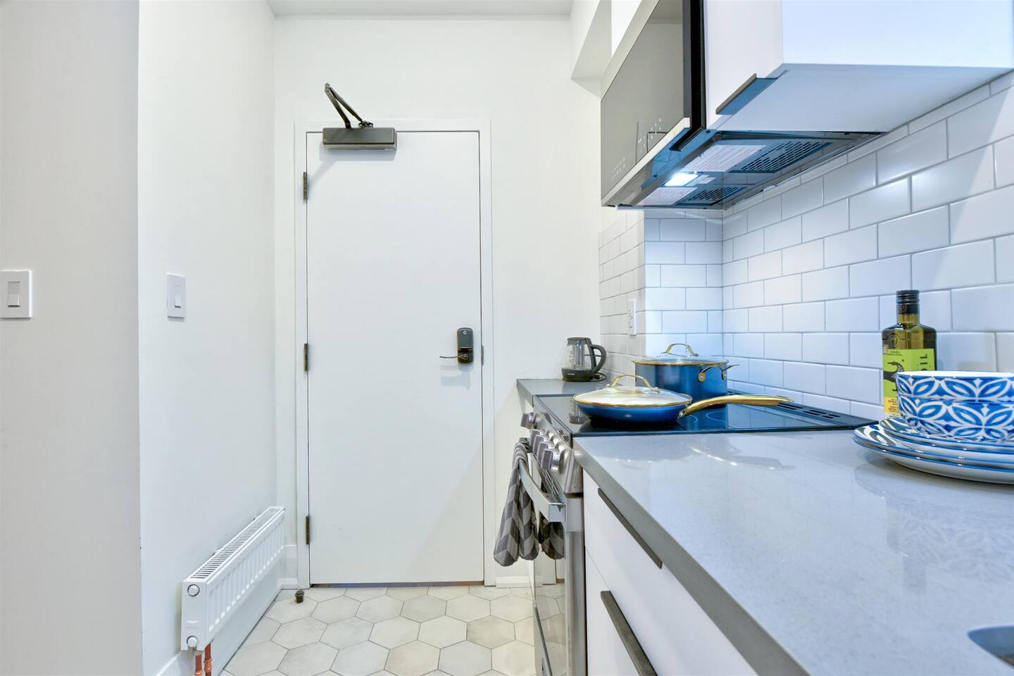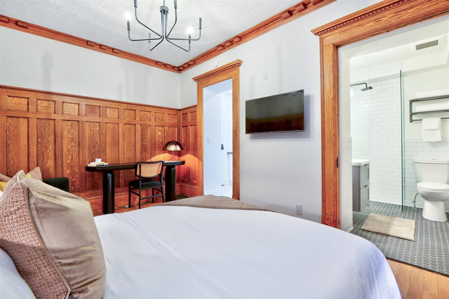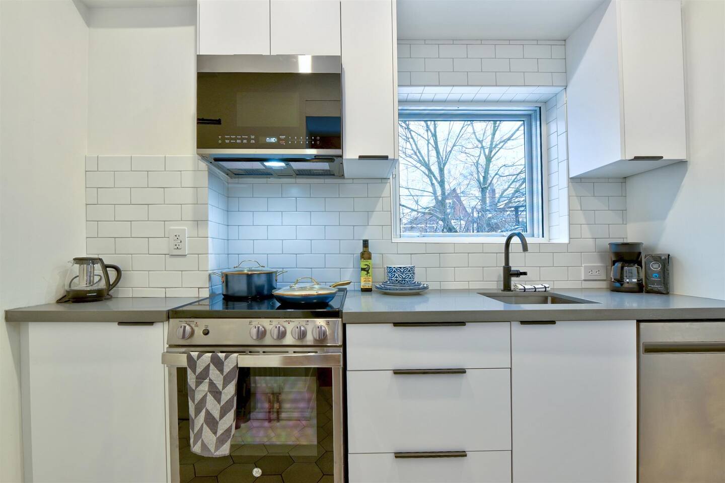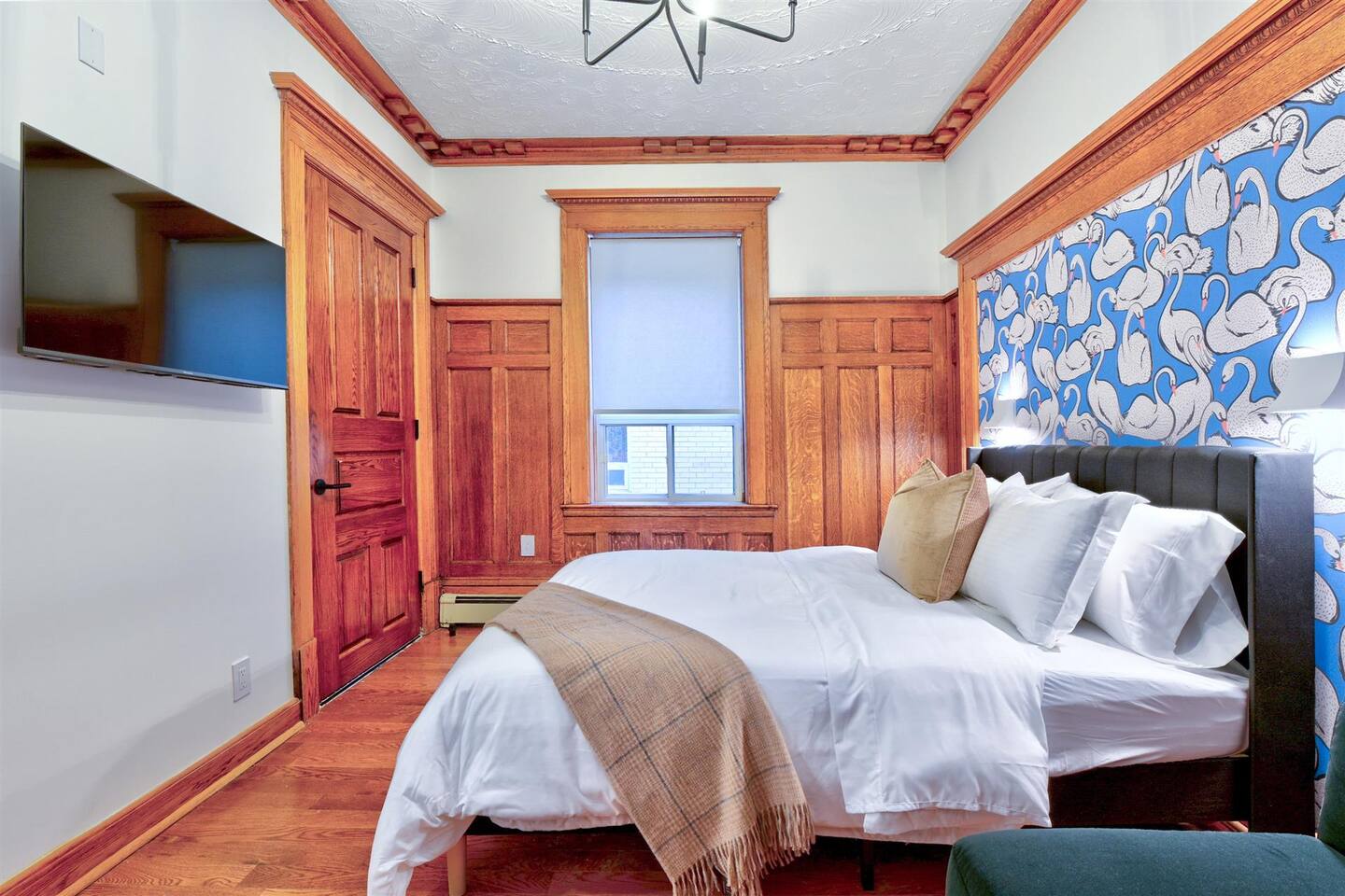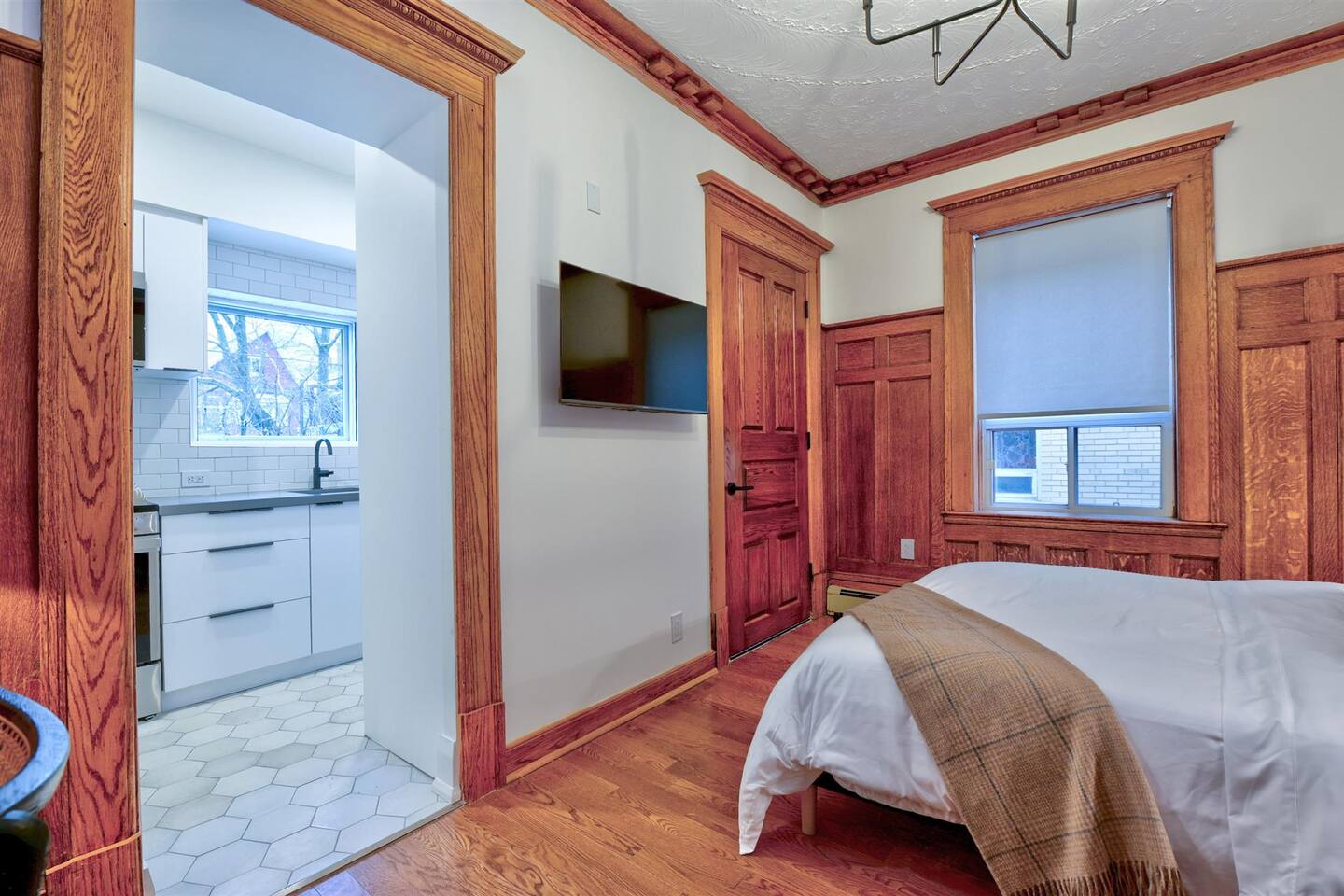 Nestled on a serene, tree-lined street, this newly renovated first-floor walk-up apartment offers the perfect mix of modern comfort and charming character. Step inside to discover a bright, stylish kitchen with sleek subway tiles, stainless steel appliances, and thoughtful design touches. The cozy bedroom boasts a stunning blend of warm wood paneling and playful wallpaper, complemented by a seating area—perfect for relaxing after a day out exploring. Whether you’re here for work or leisure, you’ll appreciate the convenient desk setup for catching up on tasks or planning your next adventure. The backyard is a shared space, perfect for enjoying the fresh air. Located in a peaceful neighborhood with mature trees, this thoughtfully designed home is a tranquil retreat with all the modern amenities you need.