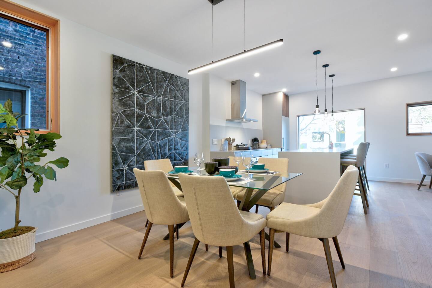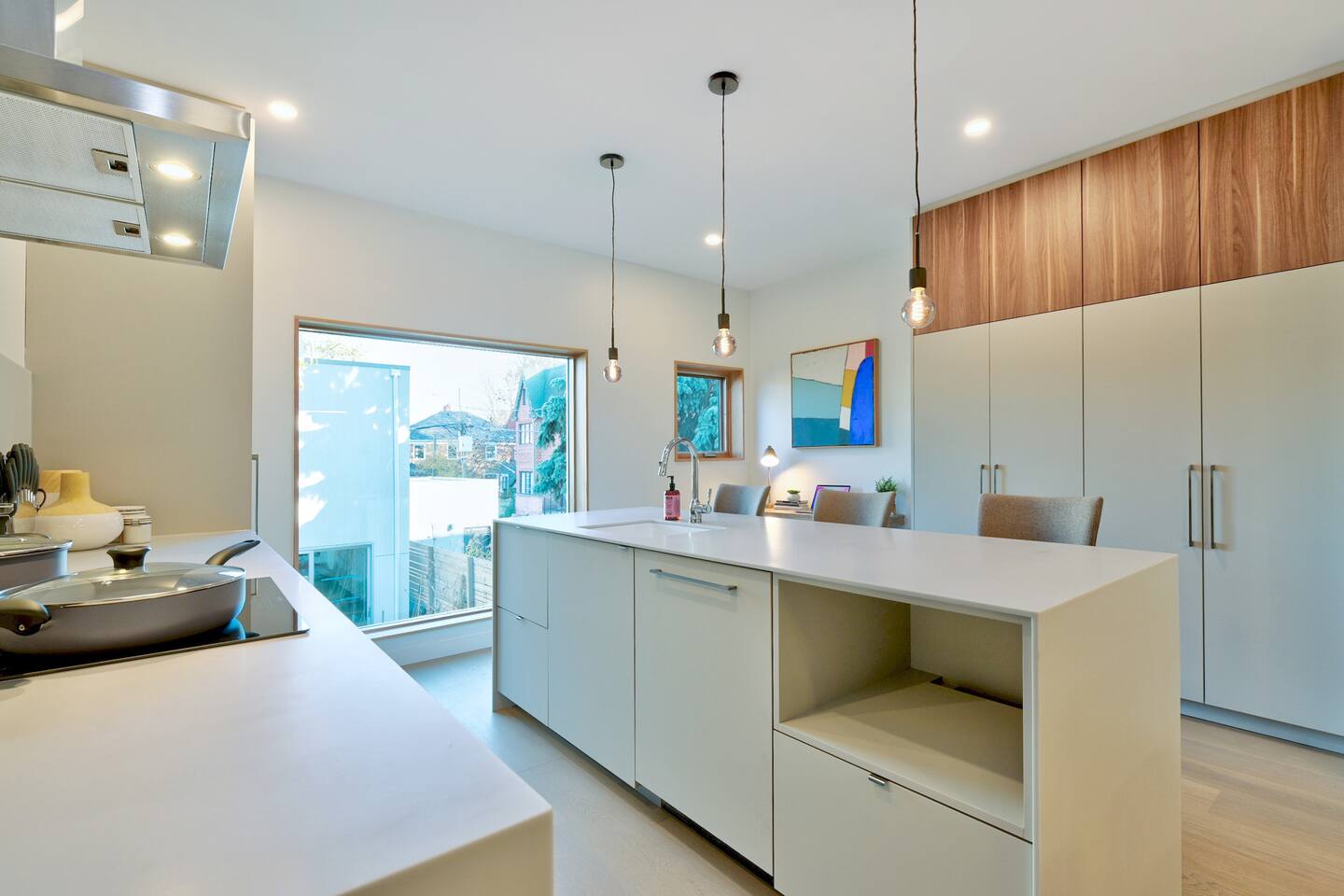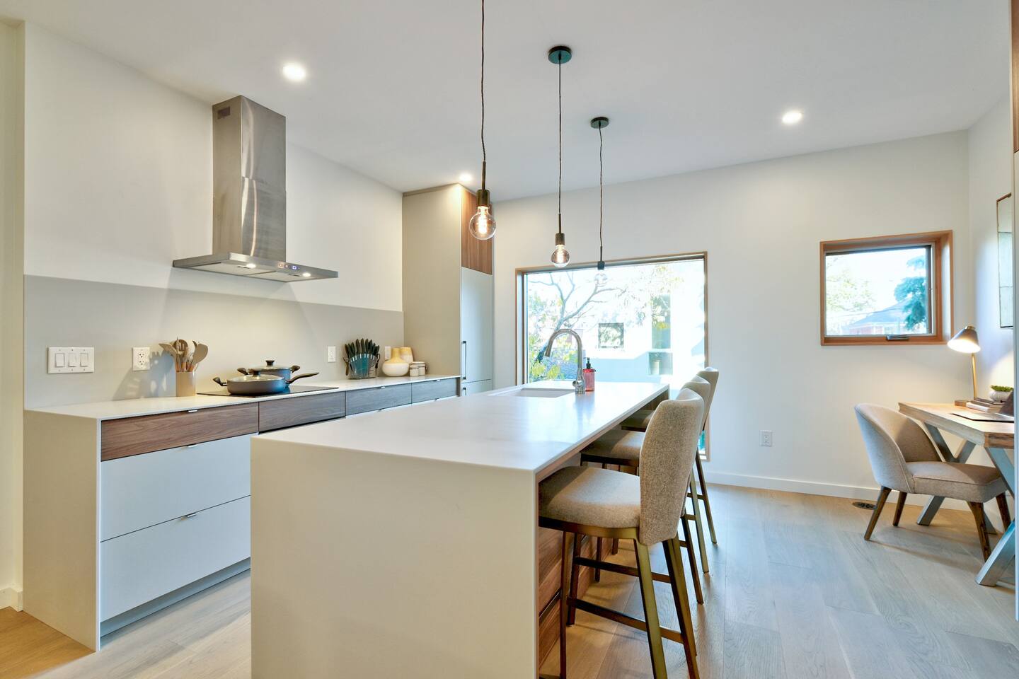 Nestled on the main level on a quiet tree-lined street this stylish 3 bed 2.5 bath home is the latest masterpiece of Creative Union Network Architects. The open-plan kitchen and dining space acts as the heart of the home complete with gorgeous wood floors, soaring beamed ceilings and an abundance of natural light. Perfect for entertaining, the kitchen is open and simply stunning with sweeping countertops, an abundance of storage and high-end appliances. The primary bedroom suite, with built-in storage and ensuite bath complete this floor along with a powder room and laundry. Walk downstairs from the split level entrance to polished concrete floors, two more ample bedrooms, storage and a spacious family living area that steps out in the green backyard.